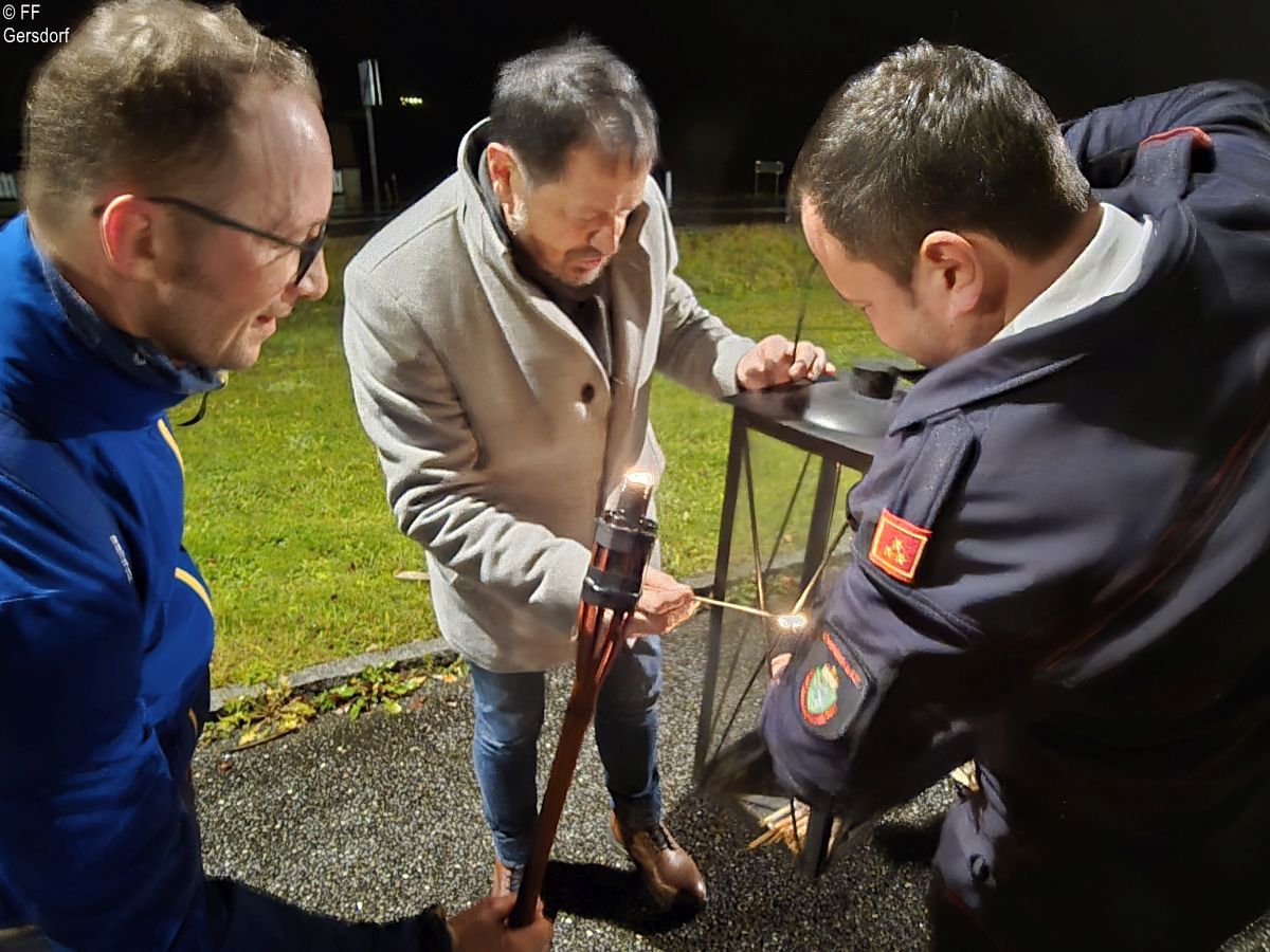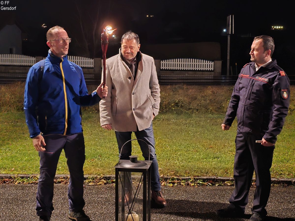 Beim Rüsthaus angekommen wurde das Licht an Bgm. Ing. Erich Prem und HBI Gerald Pichler übergeben, welche sich bei den Läufer:innen bedankten und den unschätzbaren Wert des Friedenslichtes betonten. Alles eingenommene Geld kommt der kleinen Valentina zugute, welche an der Glasknochenkrankheit leidet.