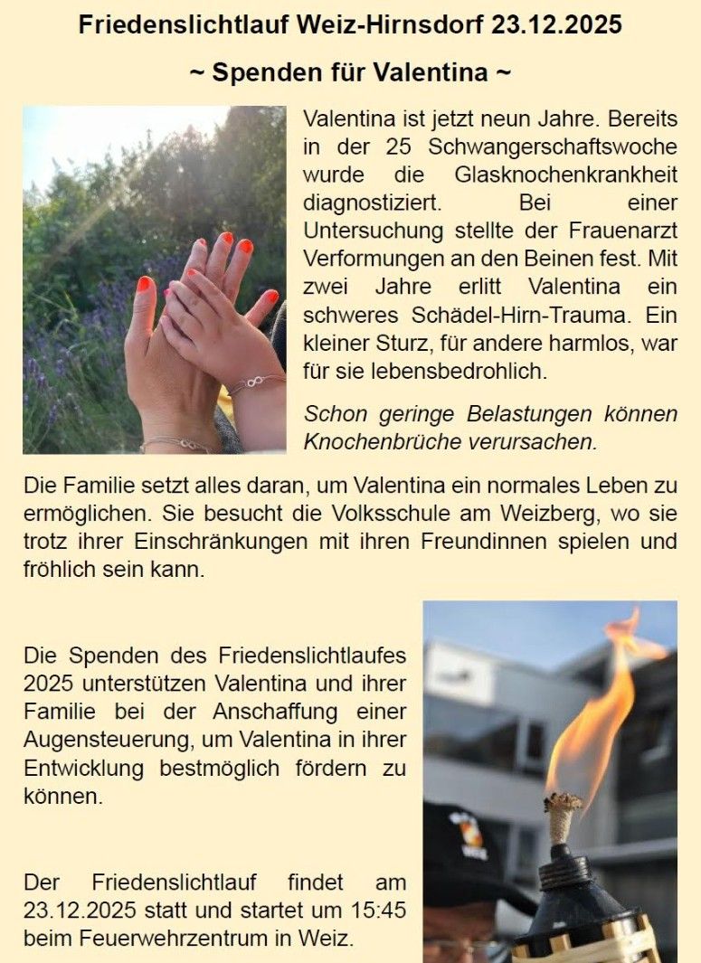 Wir danken allen Teilnehmer:innen für das Friedenslicht und allen Spender:innen, welche Geld für Valentina gespendet haben. Ebenso ein großes Dankeschön ergeht an Autohaus Loidl, Gasthaus Karlheinz Prem, Elektro Bloder, Eurospar Pischelsdorf und Buschenschank Lang für die großzügige Unterstützung.